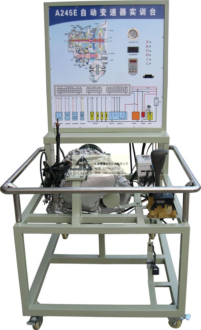 本變速器實訓臺是本公司采用一汽豐田自花冠動變速器為適應汽車教學需求而研制的,該實訓臺由電控變速器(八成新)、操作顯示面板及發動機彩色電氣原理圖電腦控制柜、可移動式臺架(萬向腳輪)、驅動系統(腳踏式油門踏板)變頻電機驅動、剎車系統(腳踏液壓盤試剎車)、啟動系統(電門鎖方式啟動)、車速傳感器、電磁閥執行器、原車電腦、具有發動機運轉及顯示(轉速.車速.檔位)、液壓油壓力顯示表(顯示換檔過程油壓)、自動變速器電磁閥工作指示LED燈、原車OBD-Ⅱ診斷座、故障設置區可設置12路故障(老師設置任一路線路故障)、故障排除區(學生通過各種儀器、儀表、)在面板上用專用排故線連接排除故障、傳感器信號模擬等多項功能、具結構緊湊、操作方便、安全可靠、教學直觀、是汽車自動變速器實物教學不可缺少的實驗室設備之一。