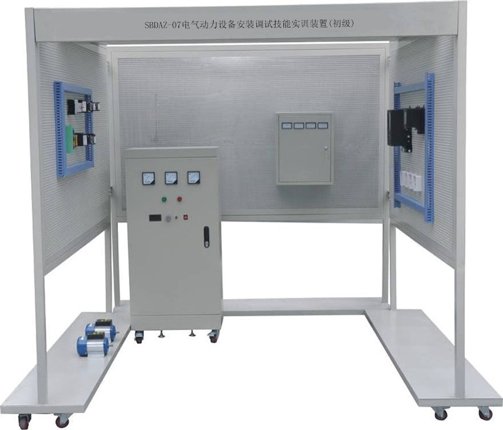 可進行電工安裝,如橋架安裝,PVC管安裝,吊燈,白熾燈座,日光燈,開關,插座,控制箱,配電箱等,包含有交流異步電動機,直流電動機,步進電機,伺服電機,溫度控制器,電偶,PLC,變頻器觸摸屏等控制與受控對象。每個操作組配套一個移動式工具車和元件柜,便于對原件的保管和安裝施工,從根本上解決了學校在普通墻面上進行安裝培訓的使用不方便,實訓范圍窄的問題。