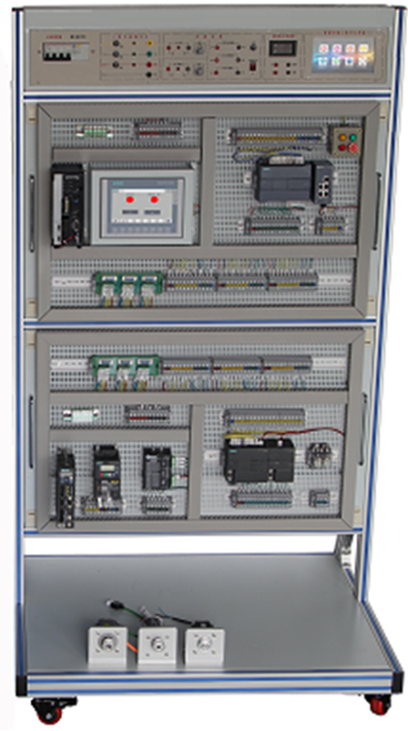 采用立式網(wǎng)孔板結(jié)構(gòu),由工業(yè)鋁型材搭建而成,上方為電源控制模塊,下方為網(wǎng)孔式安裝板。底部設(shè)有帶剎車萬向輪,方便移動布局。臺架尺寸約為1000×800×1800mm。 頂端電源模塊,提供實訓(xùn)所需的三相交流380V、單相220V電源接口,具有啟動、停止、急停系統(tǒng),設(shè)有漏電保護(hù)、電源指示、過流保護(hù)等功能。設(shè)有DC24V控制電源,配有控制開關(guān)及輸出接口,帶短路保護(hù)功能。 |