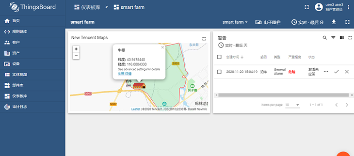 圖:智慧牧場課程案例,使用GPS對奶牛位置進行定位,通過LoRa網絡將位置信息上報,使用ThingsBoard平臺的電子圍欄工具結合騰訊地圖,實現奶牛越過電子圍欄時發送警報提醒。