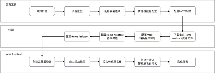 圖:智能家居課程案例,使用自動化智能家居平臺Home Assistant,對安裝好的感知層設備進行數據的瀏覽和各種自動或手動的執行操作。